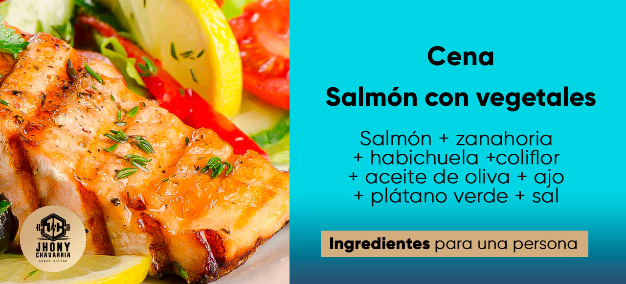 Se sirven los vegetales bañados en especies y una cucharada de aceite de oliva para acompañar el salmón y los patacones que también pueden ir acompañados de guacamole.