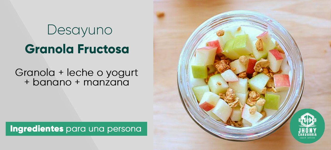 Servir la granola con las frutas picadas y la taza de leche o yogurt
