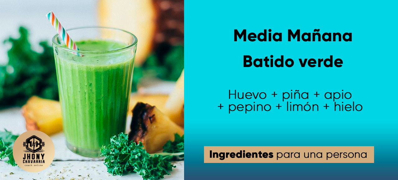Se licuan los ingredientes para el batido verde: la piña, el apio, el pepino, el limón y el hielo. Acompañar el batido con los dos huevos cocinados.