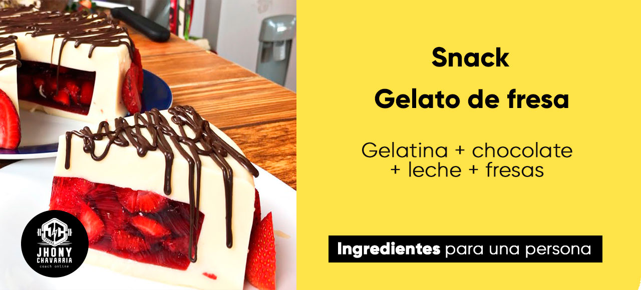 Picar las fresas en rodajas, agregar en el fondo del recipiente, poner las 6 cucharadas de gelatina y el chorro de leche, para finalizar, tritura el cacao en partes pequeñas y esparcelo desde arriba como chispas de chocolate, disfrútalo.